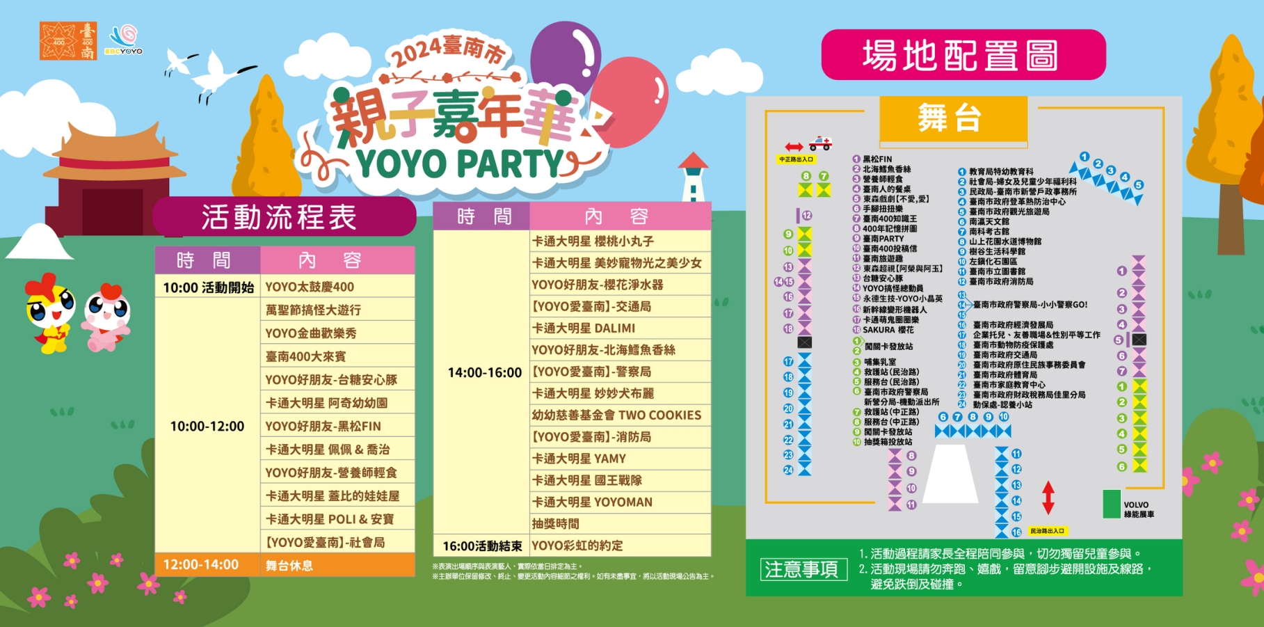 市長黃偉哲表示,台南市致力推動友善親子遊憩空間及各種優質親子活動,今年的親子嘉年華活動精彩絕倫,包含台南限定YOYO太鼓表演、YOYO版16蹲精彩舞蹈等,讓大小朋友與YOYO的哥哥姐姐一同唱跳舞動,此外,現場還有許多攤位提供民眾闖關拿獎品,邀請大小朋友把握時間,來南瀛綠都心公園參與嘉年華盛會。