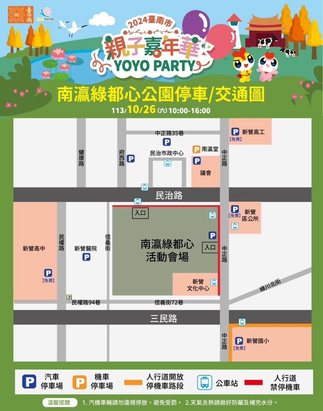 親子嘉年活動時間為10月26日上午10時到下午4時,為維持活動安全請保持人行道暢通,南瀛綠都心公園人行道請勿停放機車;為便利民眾抵達會場及方便停車,相關停車/交通資訊圖及交通懶人卡已公布在﹝教育花路米﹞FB專頁(https://www.facebook.com/tnboe )。