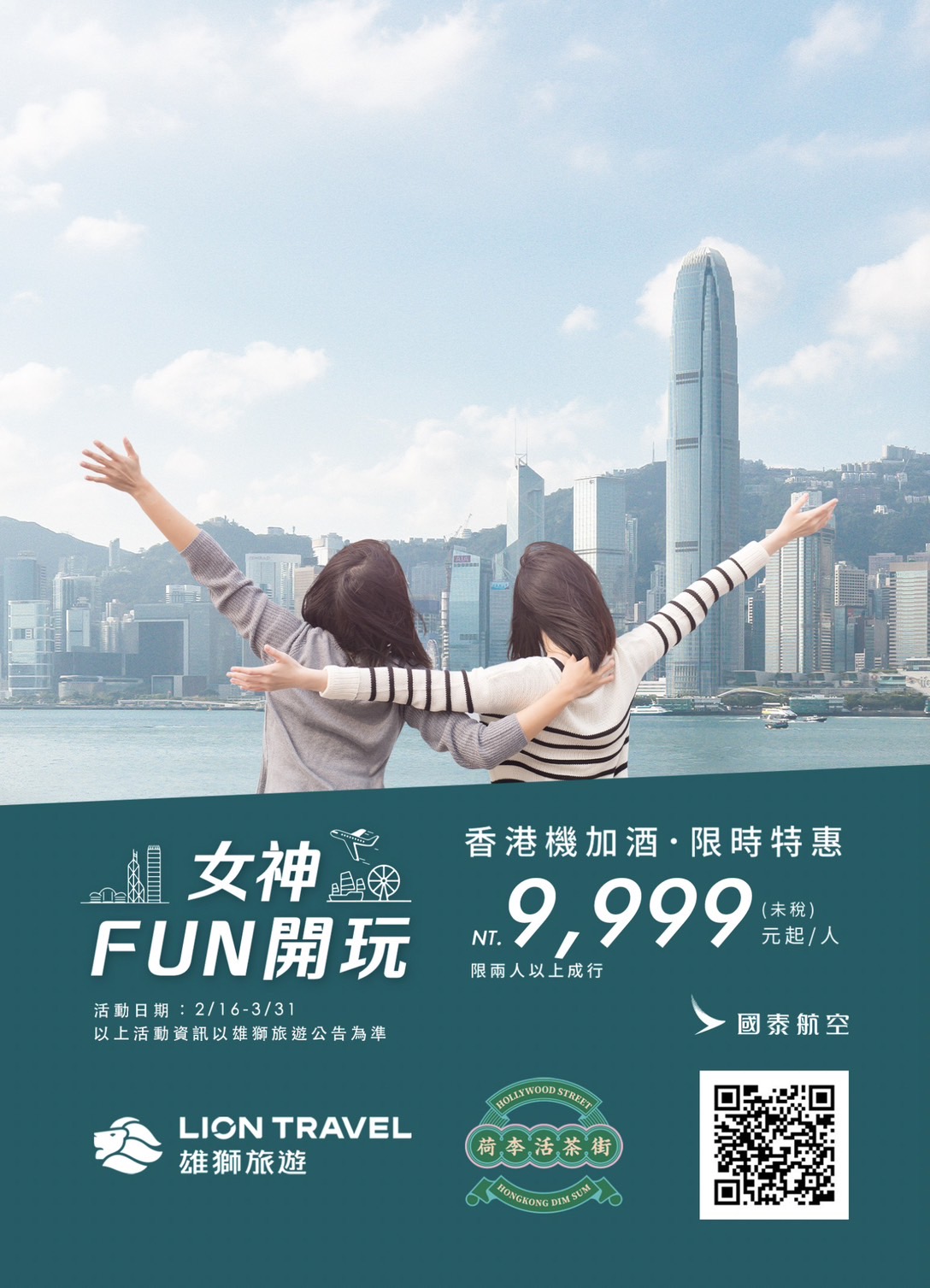 隨著國際疫情趨緩,香港也放寬入境檢疫措施,並宣布積極推廣旅遊。雄獅旅遊推出38女神節網美行程,三天兩夜機加酒最便宜只要9,999元起,再送台灣茶餐廳「荷李活茶街」招牌餐點招待劵,讓你到香港前先用餐暖身體驗在地港點美味。