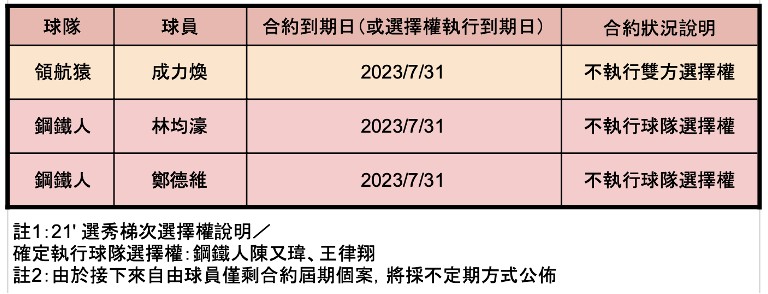 P. LEAGUE+ 今日(31)公佈2023 自由球員第二波名單,將會有3位球員成為自由球員,包含領航猿的成立煥、鋼鐵人的林均濠與鄭德維。並表示接下來自由球員僅剩合約屆期個案,聯盟將採不定期方式公佈。