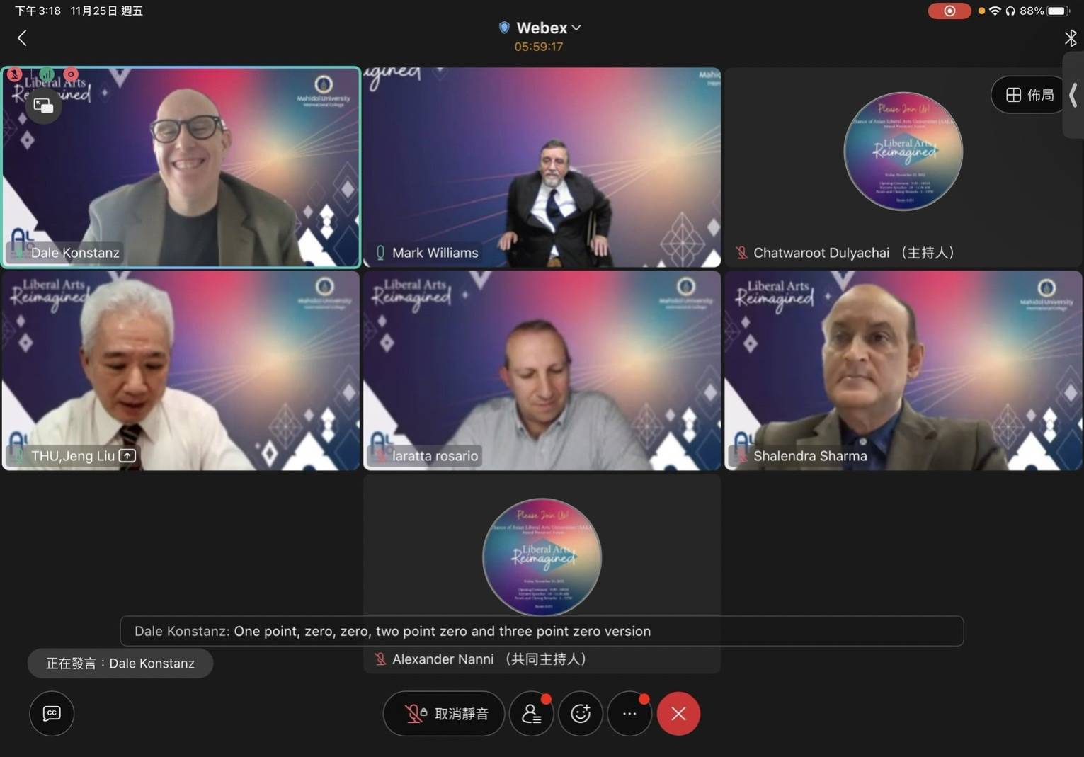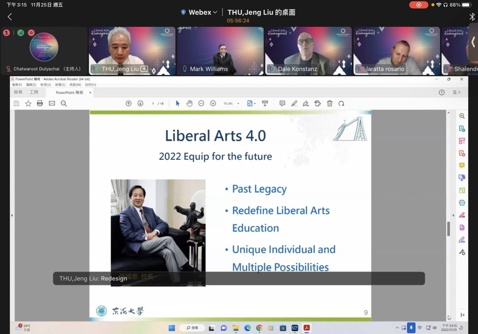 2022亞洲博雅大學聯盟 (Alliance of Asian Liberal Arts Univeristy,簡稱 AALAU) 第五屆校長論壇,今年由泰國Mahidol大學主辦,以「Liberal Arts Reimagined」為主軸,11/25成功在線上舉行。東海大學副校長劉正代表出席,與來自印度、日本、泰國、中國大陸及臺灣等16所聯盟成員學校專家學者,暢談「Liberal Arts Education in Tunghai University: Transformation and Design」。