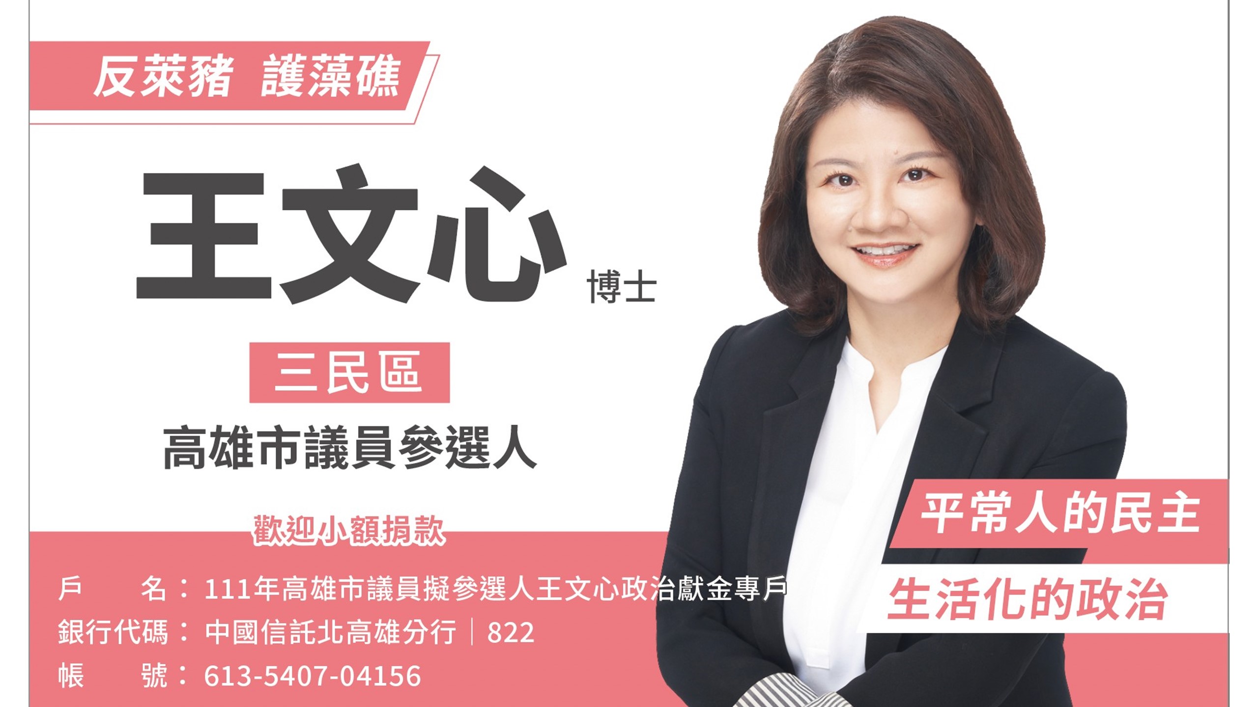 無黨籍王文心博士於8/8日父親節與在野大聯盟的蘇偉碩陪同下宣布將投入高雄市三民區市議員參選人,蘇偉碩醫師與王文心博士有著【反萊豬、護藻礁的食安神鵰俠侶】的稱號。