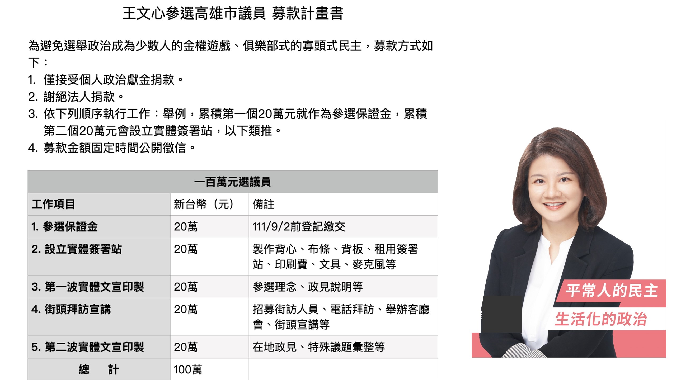 ▲王文心博士的政治獻金小額募款(圖/由王文心博士提供)