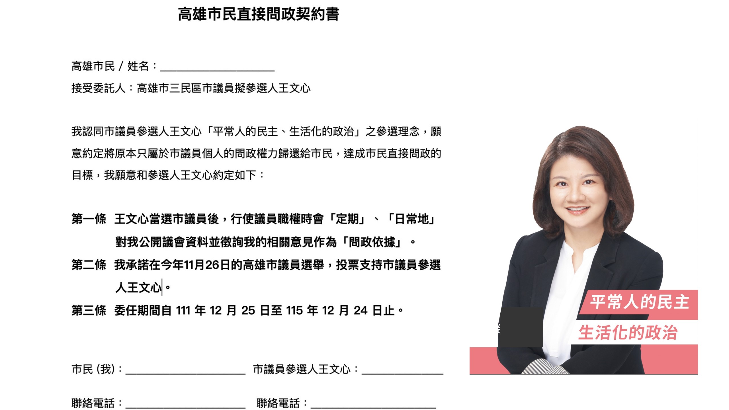 王文心宣布這次參選要採取新框架,說服認同的選民透過簽署「高雄市民直接問政契約書」,彼此做出雙向政治承諾:選民承諾支持,她則承諾當選後會定期、日常地向委任者公開議會資訊,定期徵詢委託者的意見做為問政的依據,達到市民直接問政的目標,實現真正的主權在民。