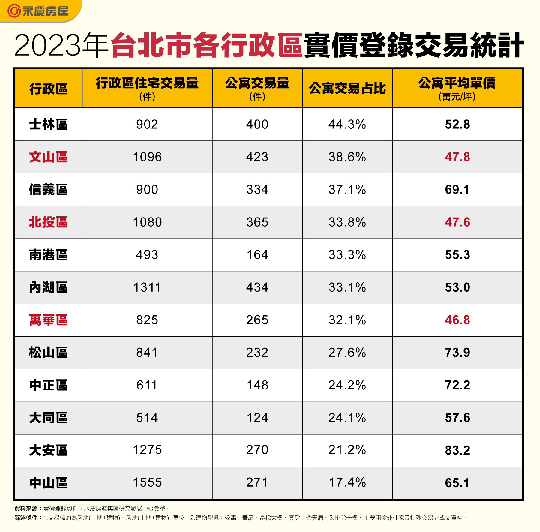 ▲永慶房產集團統計台北12行政區公寓交易占比和平均單價,士林區44.3%交易占比最高、萬華區平均單價46.8萬元最低(圖/永慶房屋提供)