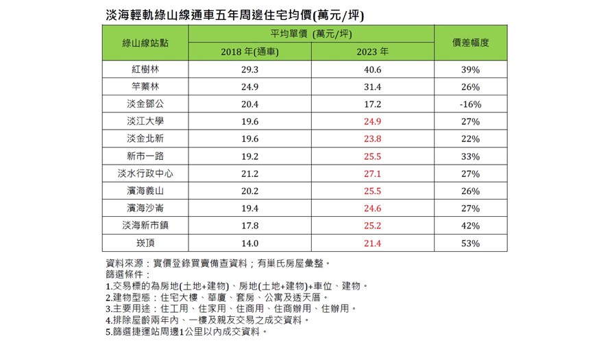 有特殊議題的三個站點為:「紅樹林站」的海岸景觀宅議題,帶動每坪單價突破40萬;「竿蓁林站」有高單價套房加持,每坪單價超過30萬;「淡金鄧公站」因周邊開發少,造成今年1-4月交易量低於5件,故2023年的平均單價較不適合參考。