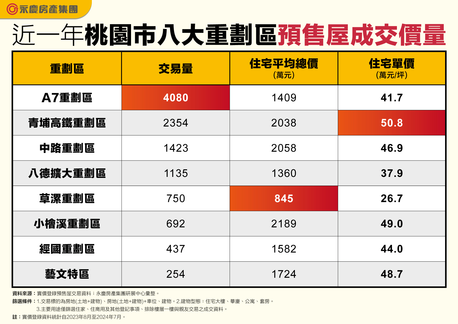 雙北房價居高不下,促動越來越多民眾轉向桃園置產,隨著雙北人口的遷入,帶動桃園市重劃區房市的交易活絡。永慶房產集團統計近一年桃園市八個主要重劃區的預售屋房市表現,其中A7重劃區近一年成交量逾4000件最多。成交價方面,青埔高鐵重劃區成交單價50.8萬元最高,草漯重劃區單價26.7萬元最為實惠,平均總價也僅為845萬元,是唯一總價不到千萬的重劃區。