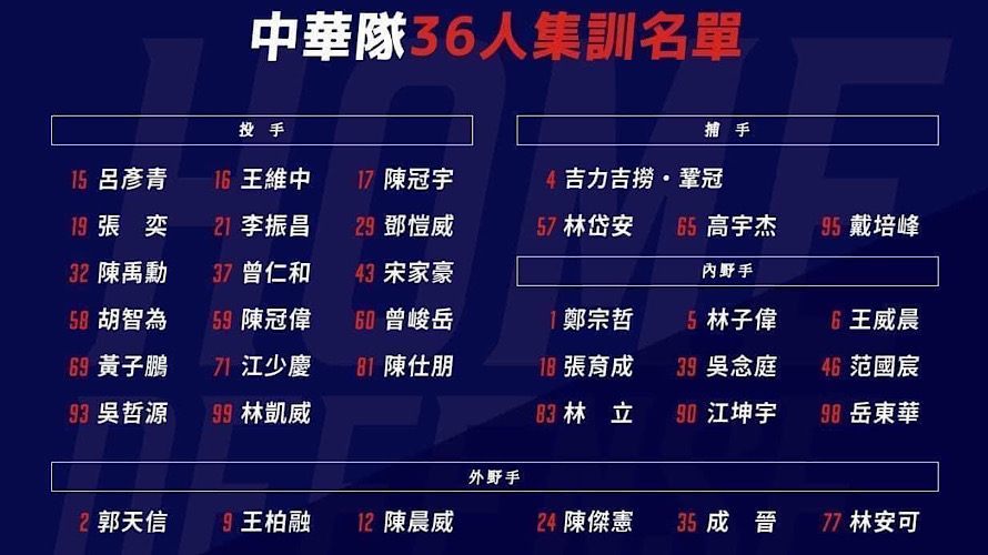 第5屆世界棒球經典賽將於3月開打,中華隊今天召開選訓會議,公布36人集訓名單,包括投手17人、捕手4人、內野手9人及外野手6人,由中職與旅外球員組成、無業餘球員,當中17名球員具有旅外資歷,現役旅外陣容共有8人,隊長由中信兄弟王威晨擔任。