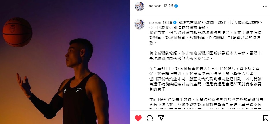 至於大陸NBL的合約,則是因為接受中華隊徵召,因此委託時任T1聯盟的協助處理。他希望事情能平和、圓滿落幕,並願以陳述事實之方式來表達立場,近期造成的紛擾與球迷負面的觀感,希望能以本發文予以澄清,並對於連日造成的紛擾深感抱歉,最後他寫下「我還是一樣熱愛籃球,也深刻的反省,未來將持續專注在球場上」。