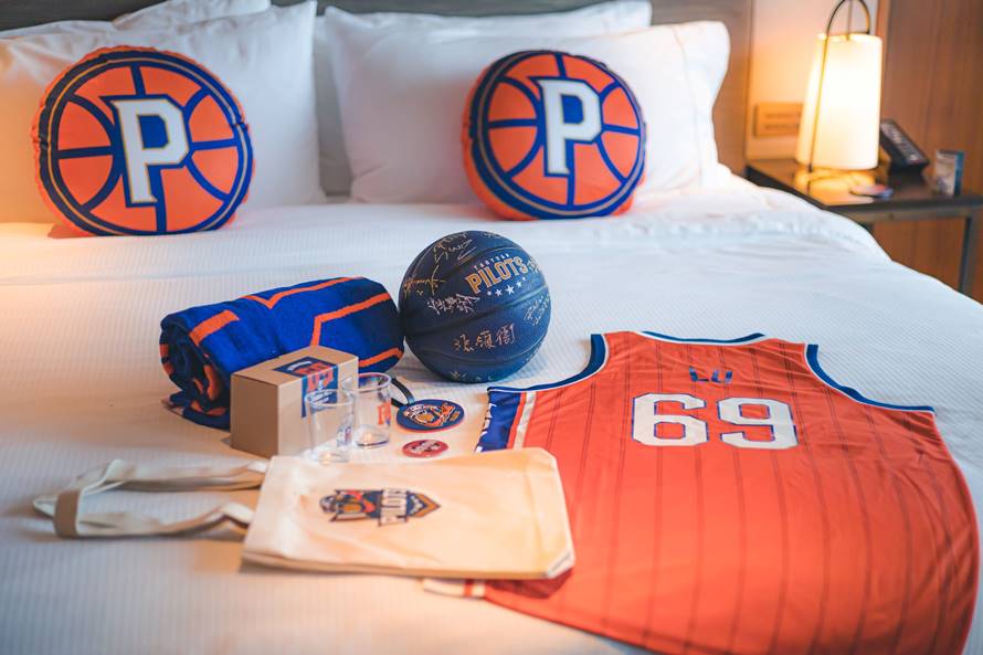本次所推出的「領航猿Take Off」主題住房專案,特別將15坪寬闊舒適、簡約奢華的單間套房完整注入領航猿元素,一開門籃球半場布置映入眼簾,搭配領航飛機模型、球星與啦啦隊小立牌,讓你走入房內猶如踏進籃球場,此外,更精心準備主廚特製領航小點,歡迎住客到來,住房更可獲得總價值近萬元的專屬迎賓禮,包含兩張主場賽事飛人席門票、客製化專屬球衣、啤酒杯組、精美行李吊牌、質感帆布袋等多樣好禮隨機組合,還有球星簽名球讓你直接帶回家,憑入住所贈門票至桃園巨蛋觀賽,再加碼獲得領航猿球星及專屬啦啦隊Pilots Crew合影機會,就是要讓熱愛籃球與領航猿的橙客們,感受獨特的度假休憩體驗。