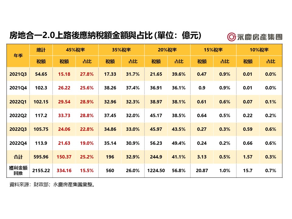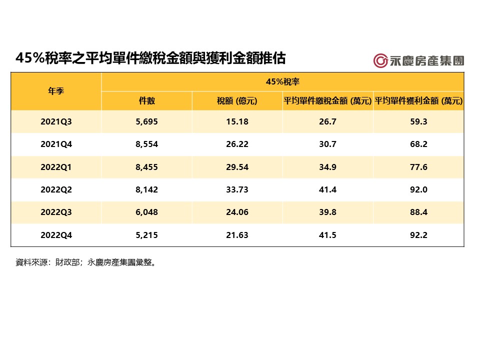 永慶房產集團統計財政部《房地合一2.0》相關數據發現,《房地合一2.0》自2021年7月上路至2022年底,遭到課徵45%重稅的房市短期交易案件突破4.2萬件(見表一),總獲利高達334億(見表二)!數據同時顯示,2022年第四季房市短期交易案平均每件獲利金額高達92.2萬(見表三)!房價推升猛烈!