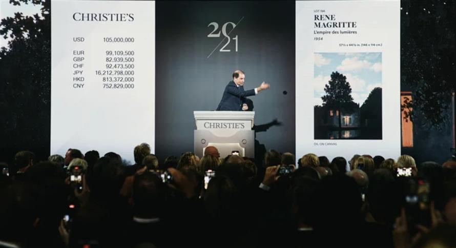 佳士得全球私人洽購部主管暨印象派及現代藝術部聯席主席Adrien Meyer為米卡艾特根珍藏中的雷尼馬格利特鉅作《光之帝國》落槌,成交價高達美元1.212億,刷新世界拍賣紀錄,亦為2024年拍場上最高成交價拍品。(圖/佳士得提供)