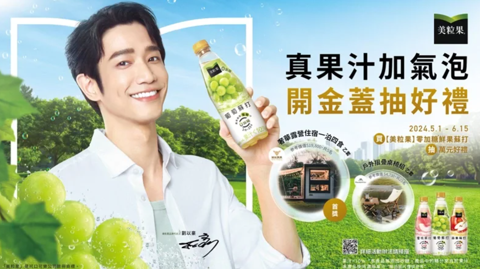 另外,「美粒果」推出的零加糖鮮果蘇打特邀劉以豪擔任代言人,他同時推薦品牌的葡萄、蘋果、蜜桃三款新風味,帶來自然清爽的感受。