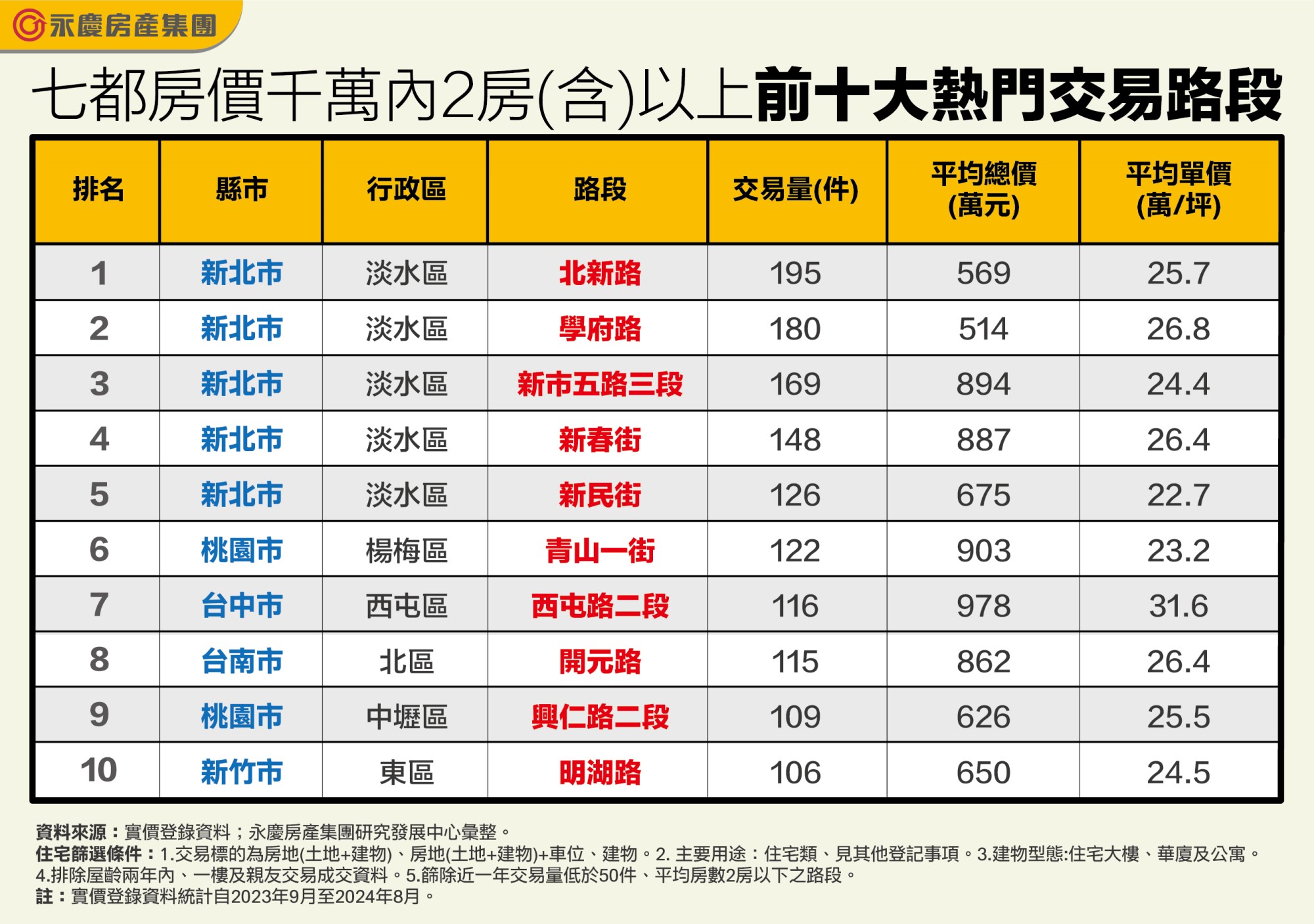 永慶房產集團統計七都近一年平均總價千萬以下、平均房數2房以上的前十大熱門購屋路段,淡水區上榜5路段最多。(圖 / 永慶房屋提供)