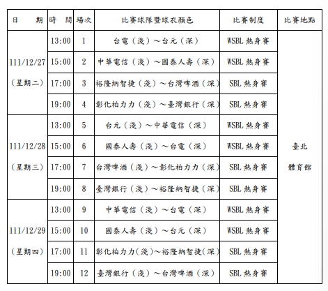 12月27日至29日臺北體育館每天將進行2場WSBL及2場SBL共4場比賽,熱身賽期間不售票,開放球迷免費參觀。