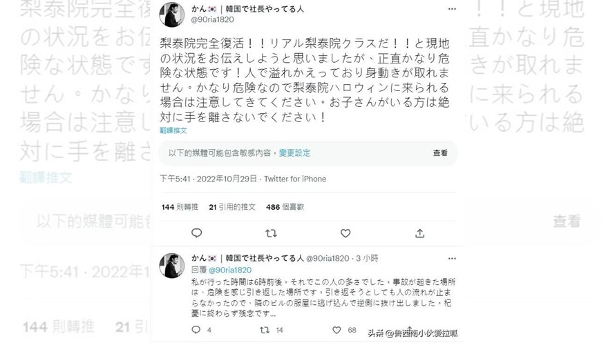 梨泰院昨日舉辦萬聖節派對,由於現場地形多斜坡、窄巷,當湧入10萬人後,根本寸步難行。一名日本男子在事發前5小時、下午5時許在推特表示,「梨泰院徹底復活了!!真正的梨泰院!」