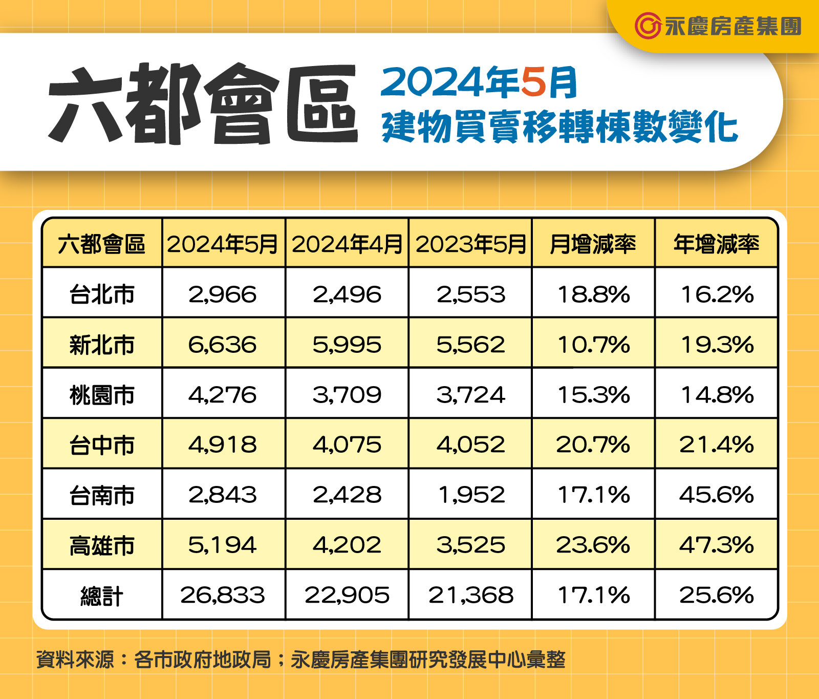 六都會區公布2024年5月「建物買賣移轉棟數」,六都交易量合計為26,833棟,是2022年1月以來單月最高,其中,新北市5月交易量6,636棟,也是2022年1月以來單月最高紀錄,而高雄市5,194棟創下歷史單月最高交易量,房市交易相當熱絡。永慶房屋研展中心副理陳金萍說明,5月六都建物買賣移轉棟數月增17.1%,六都交易量均較4月成長,台北市月增18.8%,新北市月增10.7%,且桃園市月增15.3%,台中市月增20.7%,台南市量增17.1%,高雄市月增23.6%。