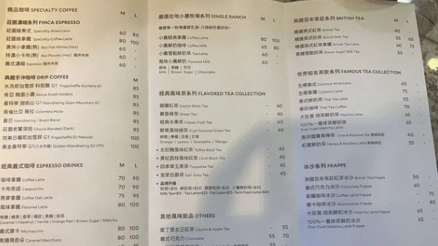 原PO在Dcard公開一份連鎖咖啡店路易莎的新菜單,稱是過年後才會換上的新價格,原PO還幫忙整理,餐食全部漲五元,加蛋變成15塊,飲料 紅茶、綠茶、果茶系列 以後只做大杯,拿鐵要升級成燕麥奶都要多收5塊,這份菜單中,莊園級拿鐵大杯要100元,義式摩卡、小農經典拿鐵、焦糖瑪奇朵咖啡也都來到100元價位,幾乎就跟一個便當一樣的價格。