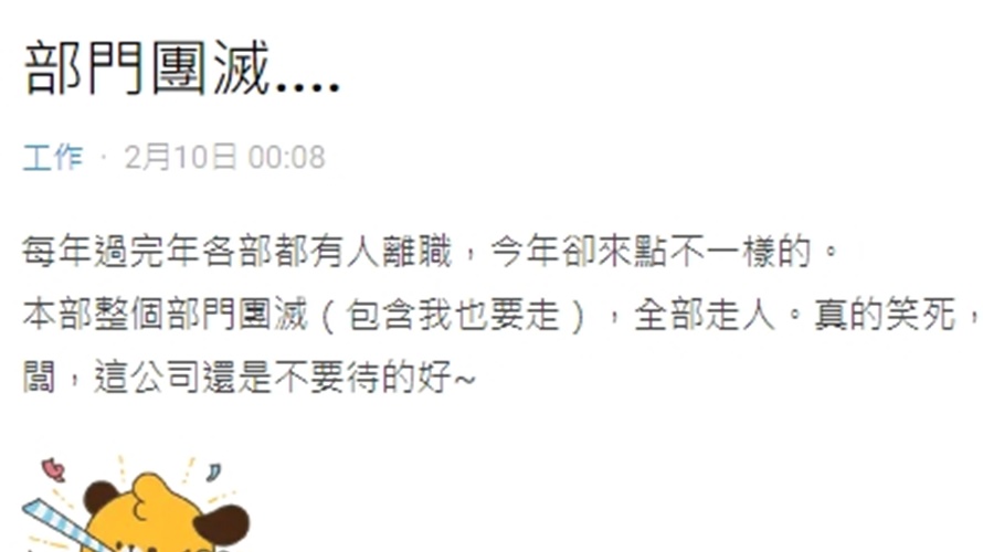 原PO在Dcard上發文,提到「每年過完年各部都有人離職,今年卻來點不一樣的。本部整個部門團滅,包含我也要走,全部走人。真的笑死,無能的主管,偏聽的老闆,這公司還是不要待的好。」