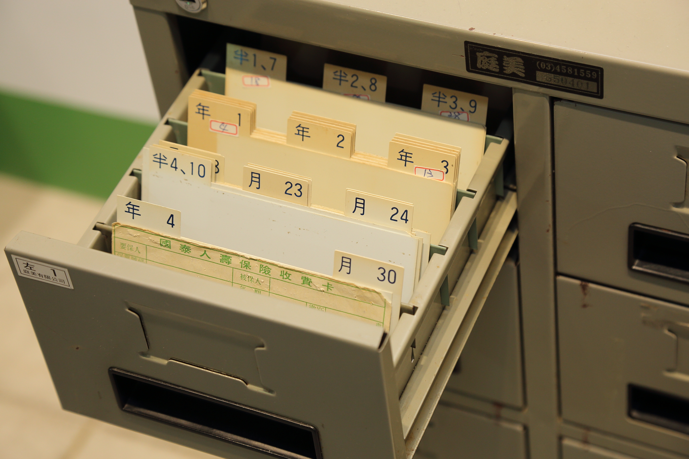 屬於老國泰人的共同回憶,過往因電腦尚未普及年代,保險費皆由人工收取,因量非常大需要以「收費卡」方式逐筆將拜訪過程、收費金額紀錄管理,業務員透過收費卡片箱依照繳費期(年繳/半年/季繳/月繳)依序排列,就像過往圖書館借書卡保管箱一般,井然有序。