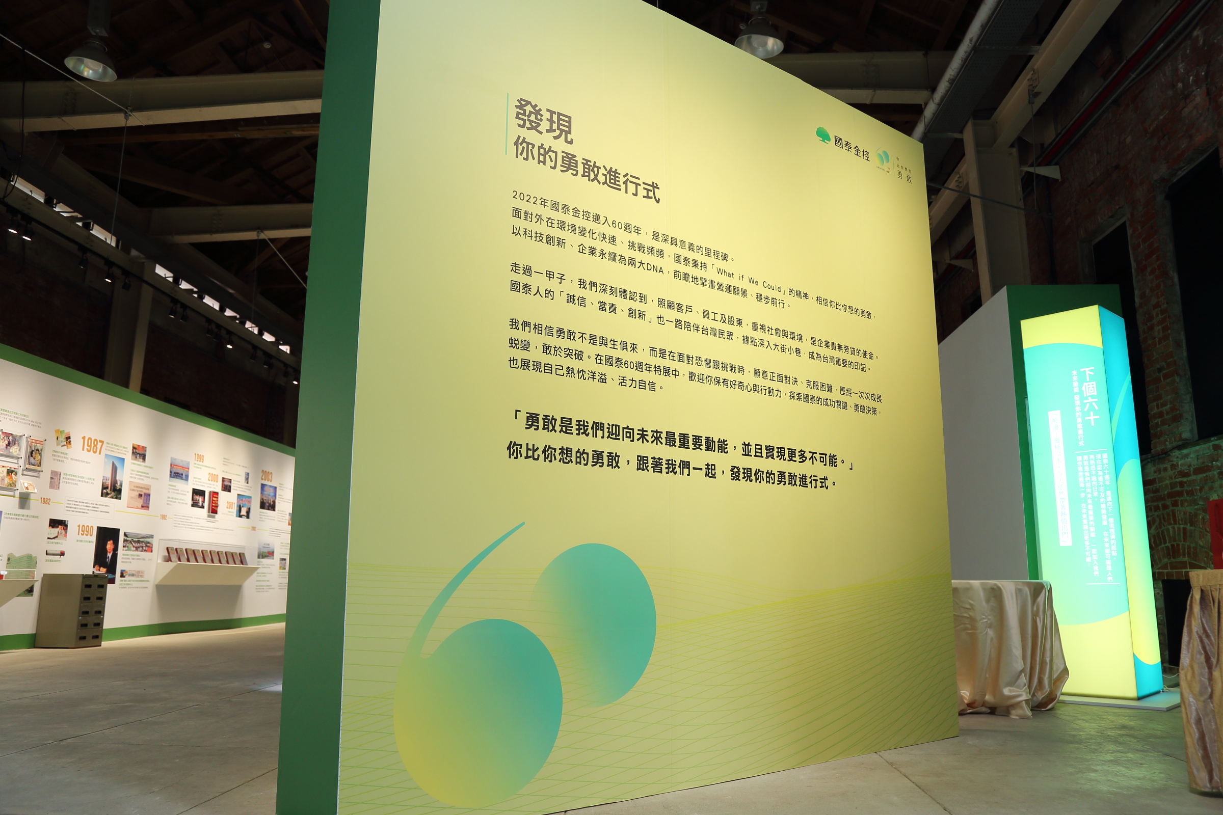 「國泰60週年特展-發現你的勇敢進行式」以勇敢宣言做開端,劃分六大展區,透過創新的互動科技展現國泰集團60年來,從萌芽到茁壯的勇敢突破。11月19日至12月7日 於「華山1914文創園區 西一館」免費展出,也邀請每一位國泰人及所有民眾前來探索國泰成功關鍵、勇敢決策,跟國泰一起發現勇敢進行式。