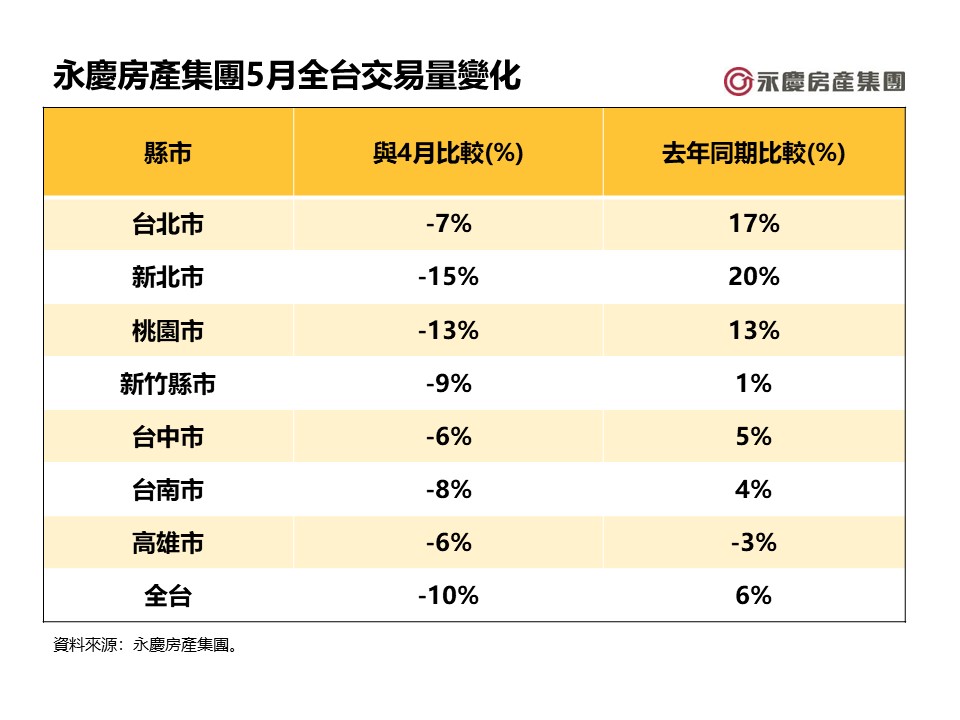 國內景氣燈號連六藍,出口年增率也出現連八黑,今年經濟成長率預估驚險保2,民眾購屋態度轉趨觀望,在連續升息以及房價仍高兩者拉鋸之下,出價轉趨保守,不過,台股近期站上萬六大關,消費者信心止跌回升,購買耐久財指標轉趨樂觀,加上通膨預期,讓屋主樂觀看待後市,讓價意願低,部分屋主甚至出現惜售的狀況,買賣雙方價格認知難有共識,讓5月全台交易量較4月減少一成。根據永慶房產集團統計:與4月相比,台北月減7%,新北量縮15%,桃園減少13%,新竹量縮9%,台中減少6%,台南與高雄則分別量縮8%與6%。