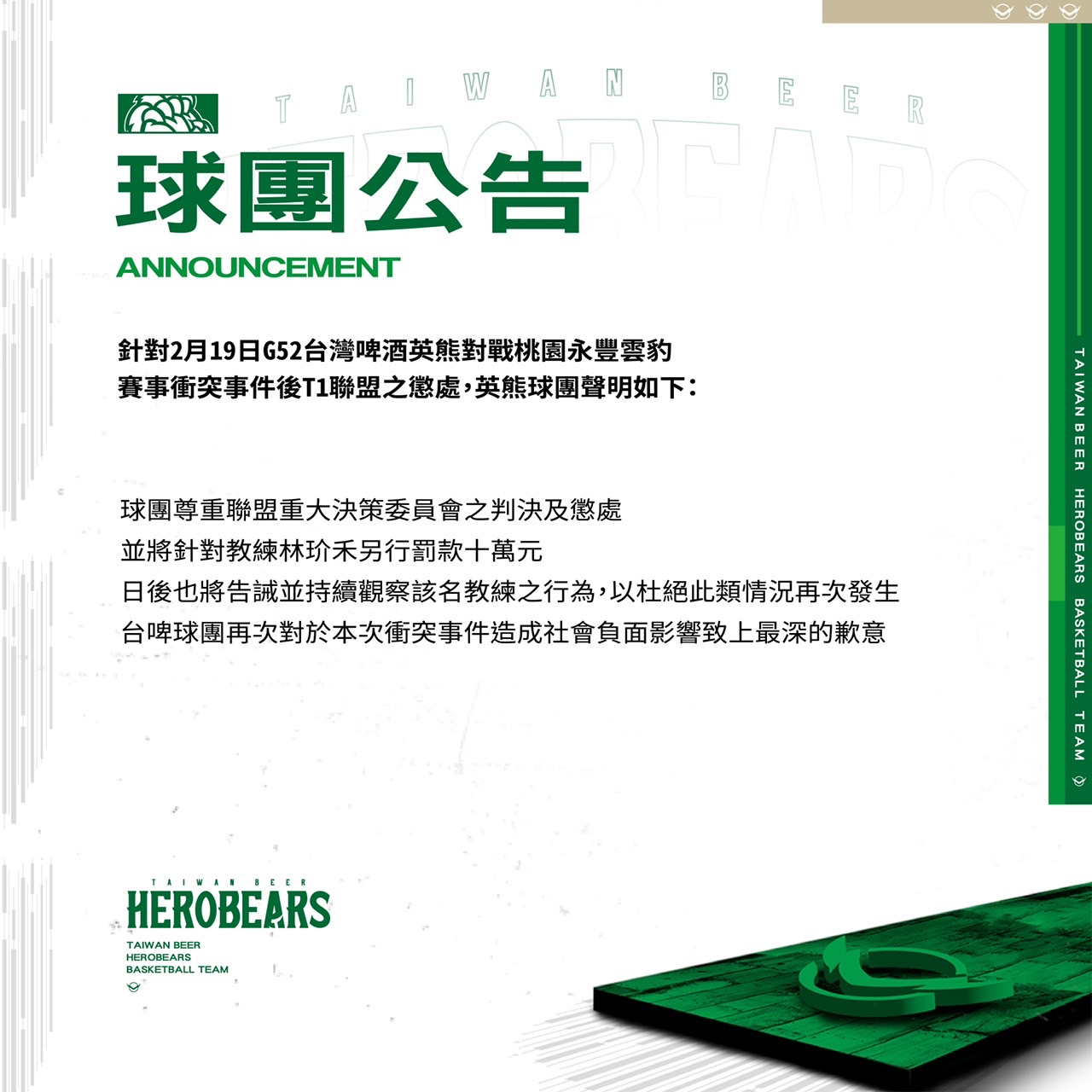 針對2月19日G52台灣啤酒英熊對戰桃園永豐雲豹賽事,發生衝突事件後T1聯盟之懲處,台啤英熊球團20日晚間發出聲明,表示將再對助理教練林玠禾開罰10萬元。