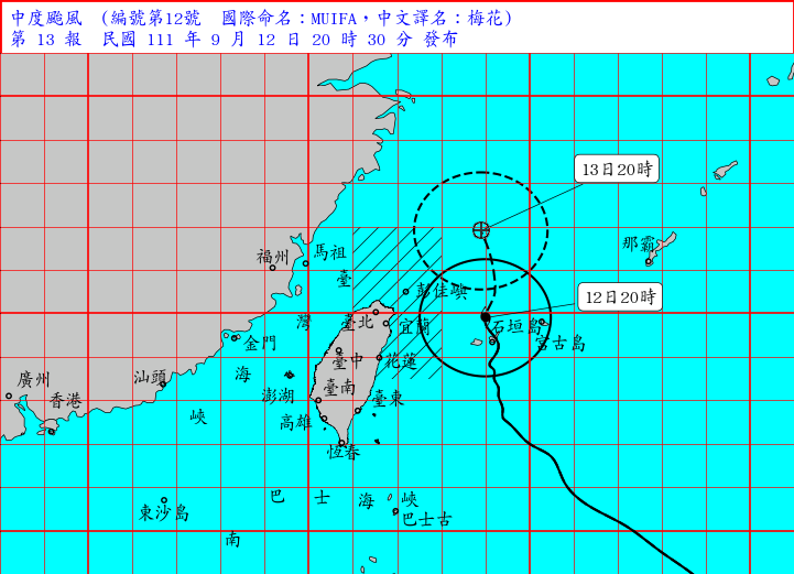 今年第12號颱風梅花的中心位置,目前在台北東方海面,以每小時10公里速度向北轉北北西移動,其暴風圈已進入台灣東北部及北部近海,對台灣東北部及北部海面構成威脅。外圍環流影響,易有短延時強降雨,新竹縣及新北市、桃園市、苗栗縣、宜蘭縣山區有局部大雨或豪雨,北部、東北部地區及臺中、南投山區有局部大雨發生的機率,請注意強陣風、坍方、落石及溪水暴漲。