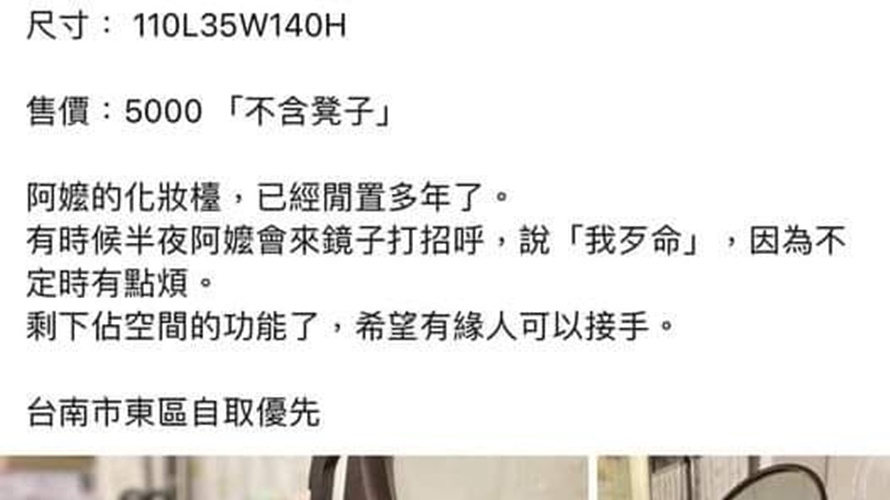原PO在網路上發文要賣家中的化妝台,老舊的化妝台,原PO還寫出要販售原因,「阿嬤的化妝台,已經閒置多年了,有時候半夜阿嬤會來鏡子打招呼,說『我歹命』,因為不定時有點煩,剩下占空間的功能了,希望有緣人可以接手。」地點在台南東區,自取優先。