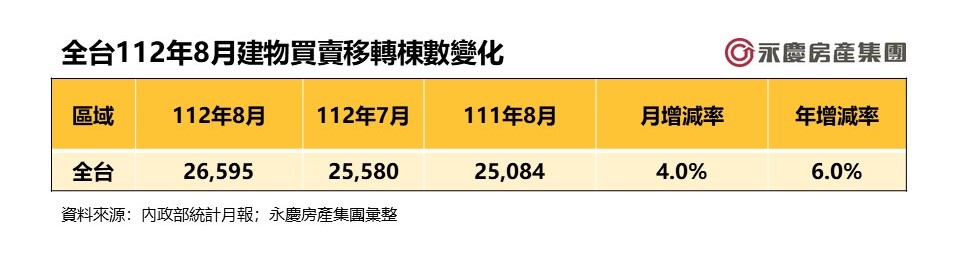 根據內政部最新資料顯示,8月全台建物買賣移轉棟數為26,595棟,月增4.0%,永慶房屋研展中心副理陳金萍說明,8月的建物買賣移轉棟數反映的是7月至8月初的市況,過去缺工、缺料的狀況逐漸緩解,各都會區陸續出現交屋潮,推升建物買賣移轉棟數表現;此外,因民眾對於通膨常態化的預期,購屋意願仍高,顯示在房市政策衝擊淡化的狀況下,房市回歸供需面,市場交易仍以自住與長期置產需求為主力,讓全台8月建物買賣移轉量較7月小增4.0%。