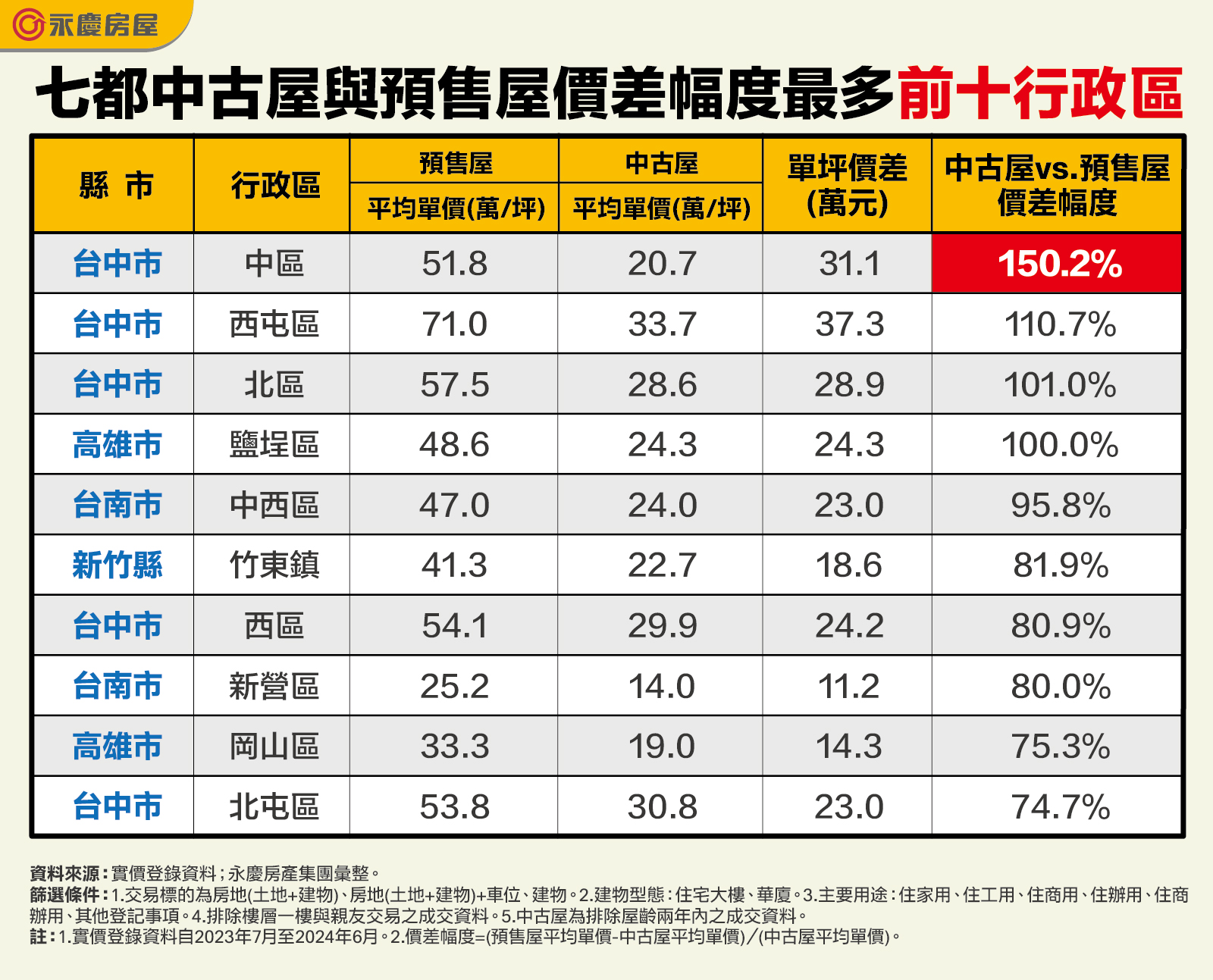 預售屋的價格往往反映著對未來房價的預估,容易成為區域房價的先行指標,近年隨著台灣經濟穩健發展、資金湧入房地產市場,使預售屋房價飆升,與中古屋價差逐漸擴大。永慶房產集團根據實價登錄預售屋、中古屋交易資料,盤點近一年七都行政區預售屋與中古屋的平均單價價差幅度,前十名上榜的行政區中,就有一半位在台中市;其中,台中市中區預售屋比中古屋價格高逾1.5倍,位居七都之冠。