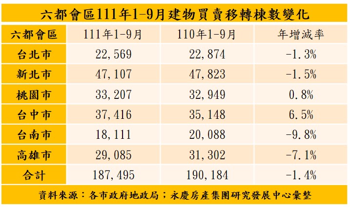 六都會區分別公布111年9月「建物買賣移轉棟數」,六都交易量合計為18,358棟。永慶房屋研展中心副理陳金萍說明,9月份六都建物買賣移轉棟數月減4.2%,台北市月減12.4%,新北市月減7.8%,桃園市月增5.2%,台中市月增1.8%,台南市月減12.9%最多,高雄市月減5.6%,除桃園、台中外,其餘四大都會區均量縮。陳金萍表示,由於房市交易與登記約莫有1個月左右的時間差,因此9月建物買賣移轉棟數主要是反映8月至9月初的市況,全球通膨攀高,而俄烏戰爭未歇,通膨難有趨緩的機會,經濟復甦力道放緩,全球股、匯市也出現大幅震盪,衝擊民眾對經濟前景的信心,加上8月初兩岸關係緊張,地緣政治風險增,面對諸多不確定性環繞,讓市場觀望氣氛濃厚,民眾購屋態度轉趨謹慎,房市交易熱度降溫。不過桃園與台中因交屋潮挹注下,交易量不減反增。