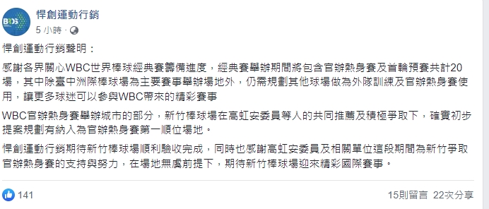 到底有沒有這個局?WBC主辦單位悍創運動行銷公司用正式聲明在臉書公開貼文表示,「感謝各界關心WBC世界棒球經典賽籌備進度,新竹棒球場在高虹安委員等人的共同推薦及爭取下,確實已規劃為官辦熱身賽第一順位場地。感謝高虹安委員及相關單位這段期間為新竹爭取官辦熱身賽的支持與努力,在場地無虞前提下,期待新竹棒球場迎來精彩國際賽事。」