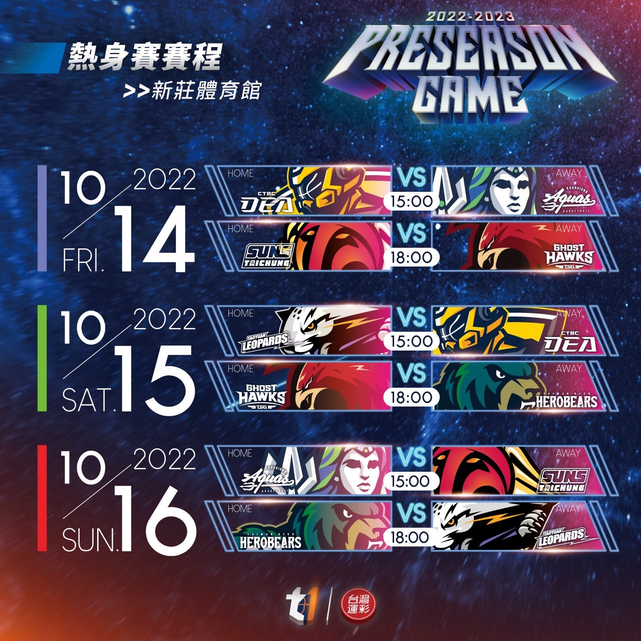 台灣運彩xT1聯盟2022-2023官辦熱身賽將於10月14日至16日在新莊體育館舉行,並於9月30日中午12時全家網路售票系統與FamiPort準時販售應援票券,今年特別規劃「球隊應援票」,凡購買「球隊應援票」的球迷朋友,只要該隊當日贏球,就可以憑票根進場看下一場該球隊的賽事!