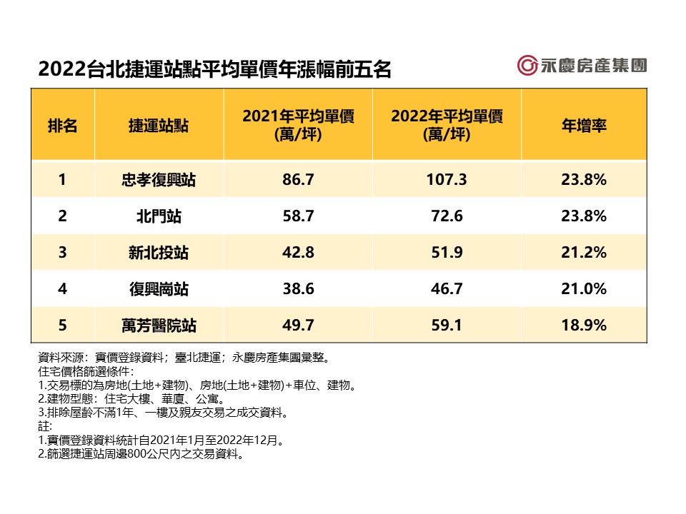 不管是上班、出遊,大台北地區居民的生活已離不開台北捷運,住在捷運站附近是許多台北居民選擇居所的優先考量。若是該站點未來發展有利多,或是環境優秀具有增值機會,更是一大優勢。永慶房屋盤點2022年台北捷運118個站點周遭平均房價漲幅,年漲幅前五名分別為忠孝復興站、北門站、新北投站、復興崗站和萬芳醫院站。