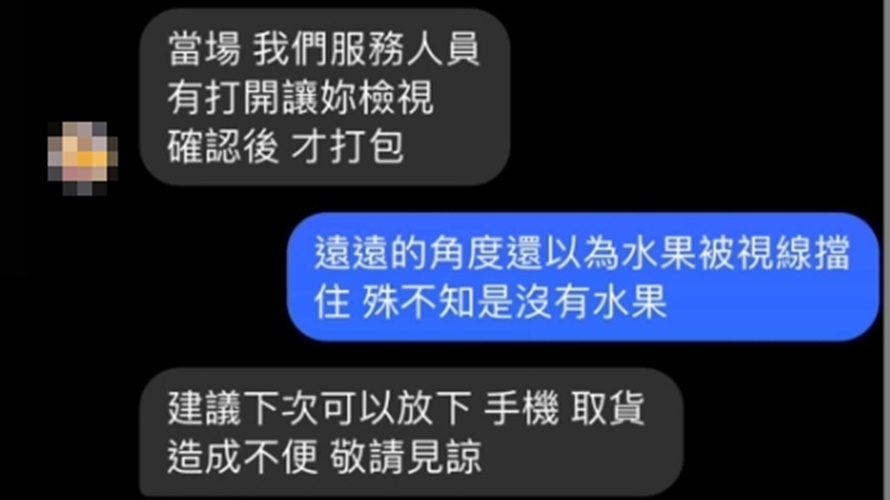 原PO在臉書社團「爆怨公社」發文,網路訂了母親節蛋糕,現場服務人員確實有打開,家人遠看有綠色抹茶,以為視線死角,水果被包裝擋到,回家後才發現塔上沒水果,向店家反映後,店家的回覆是建議下次放下手機取貨,造成不便,敬請見諒。原PO表示,購買的地點在桃園中壢區,踩雷經驗要網友小心。