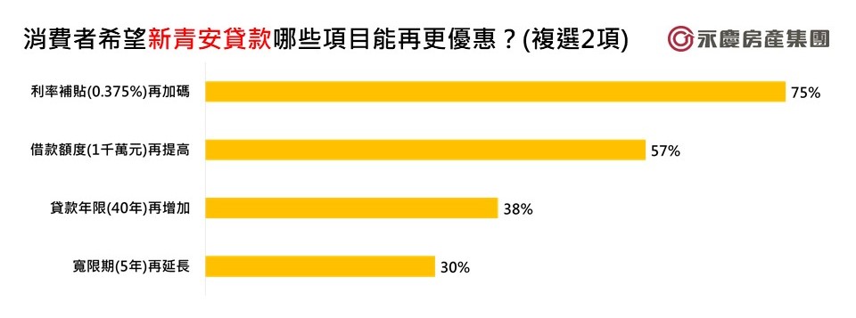 那麼,若是有機會讓「新青年安心成家方案」優惠貸款的優惠再擴大,消費者會希望哪一項可以再更優惠呢?陳賜傑表示,以利息補貼再加碼與貸款額度再提高最受期待(圖五),占比分別為75%與57%;顯示在房價高漲的狀況下,考驗消費者購屋負擔能力,提高貸款額度能降低購屋門檻,利息補貼則能減輕每月房貸支出壓力,是消費者最期待的房貸優惠條件。