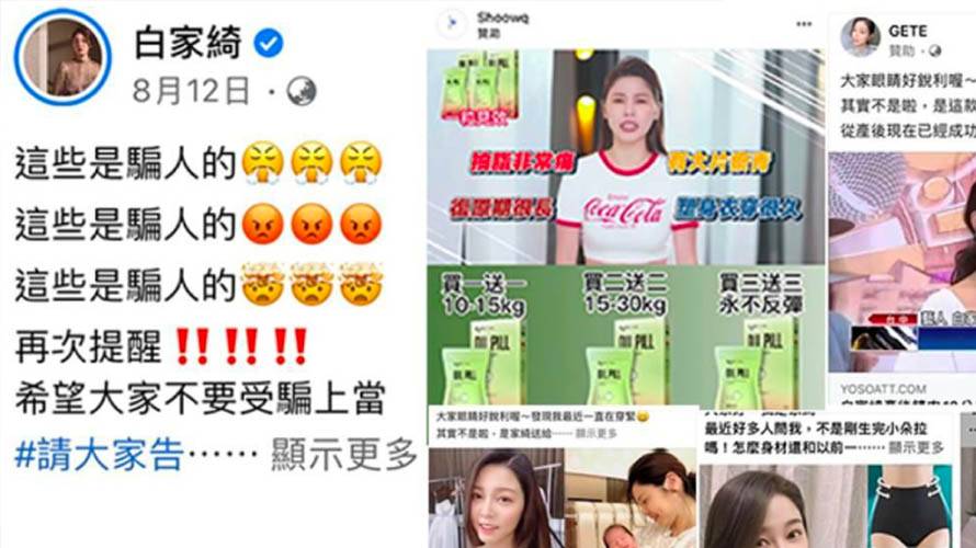 詐騙集團盛行,柬埔寨詐騙事件被揭發後,民眾又紛紛開始注意詐騙新聞。其實網路詐騙事件從來沒 有間斷過,根據統計,藝人白家綺就是最好的例子! 從早期盜圖打廣告到現在盜影片胡亂剪輯,這些不肖詐騙業者,他們以白家綺的名義,聲稱白家綺產 後發胖,全靠他們家的產品瘦了 15 公斤。 但白家綺說這全是虛構出來的,氣得一直在臉書提醒粉絲,一頁式廣告就連警方都難追源頭,應盡量 避免透過臉書一頁式廣告購物,以免成為冤大頭。