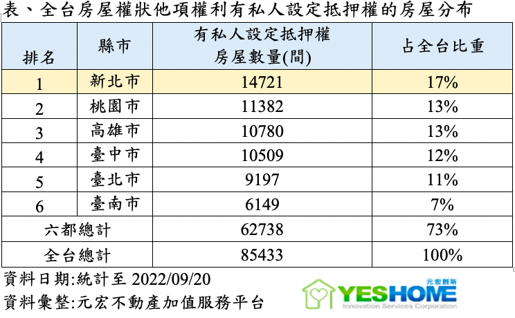截至9/20日止,目前全台房屋建物謄本「他項權利部」中有「私人設定」抵押權的房屋數量高達85433筆,有八萬多個屋主有拿房子向民間私人或公司進行借貸並設定抵押權。因這些屋主資金需求相對較一般屋主更大,最有急售、低價售屋的可能。而觀察這些私人設定房屋分布,有高達73%集中在六大直轄市,並以新北市的14721間,居全台各縣市之冠。