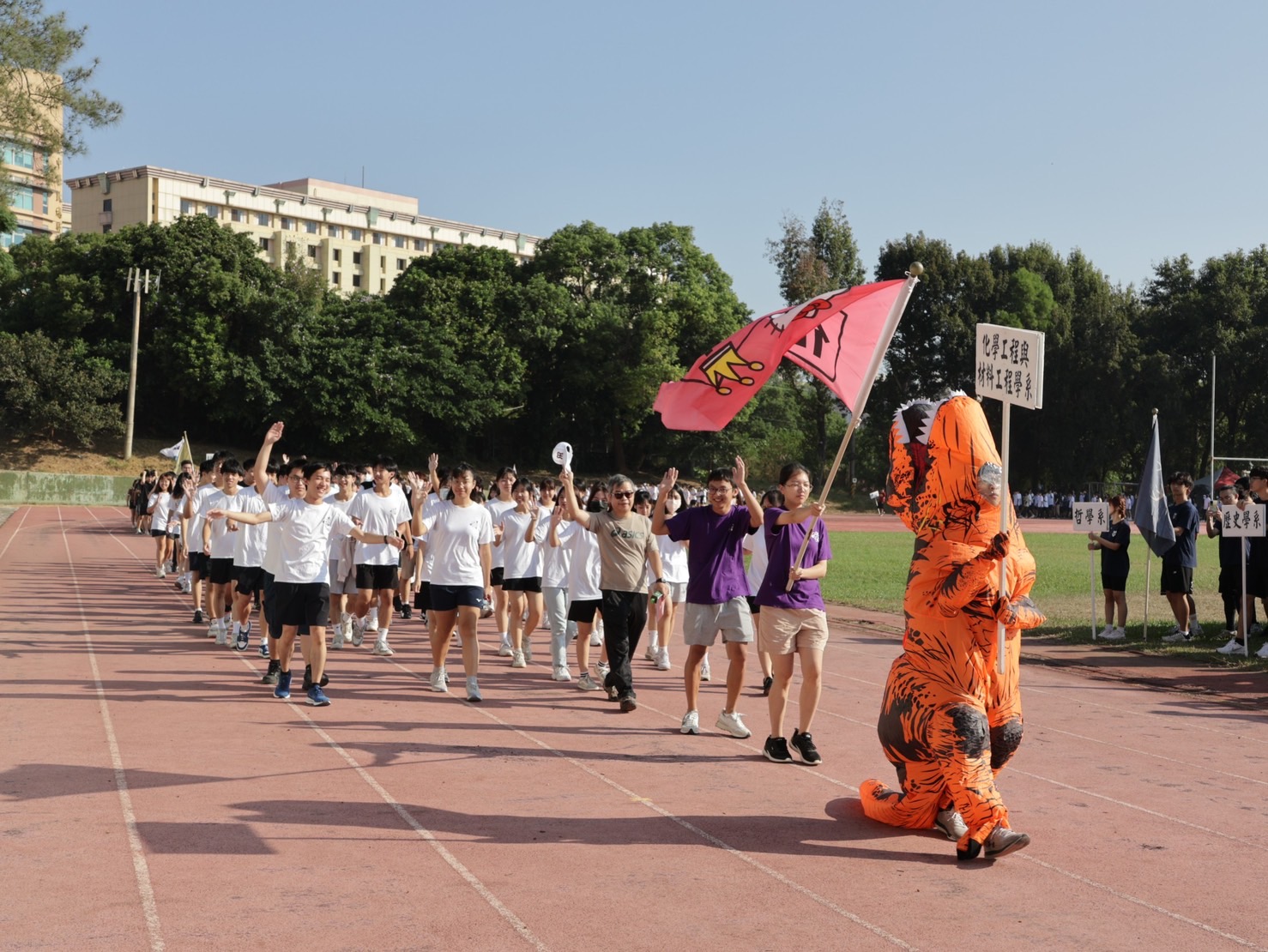 ▲東海舉行68週年校慶運動大會,由全校各院系師生隊伍朝氣蓬勃依序進場,其中最受人矚目的是化材系喬裝可愛的小恐龍。(圖/東海大學提供)