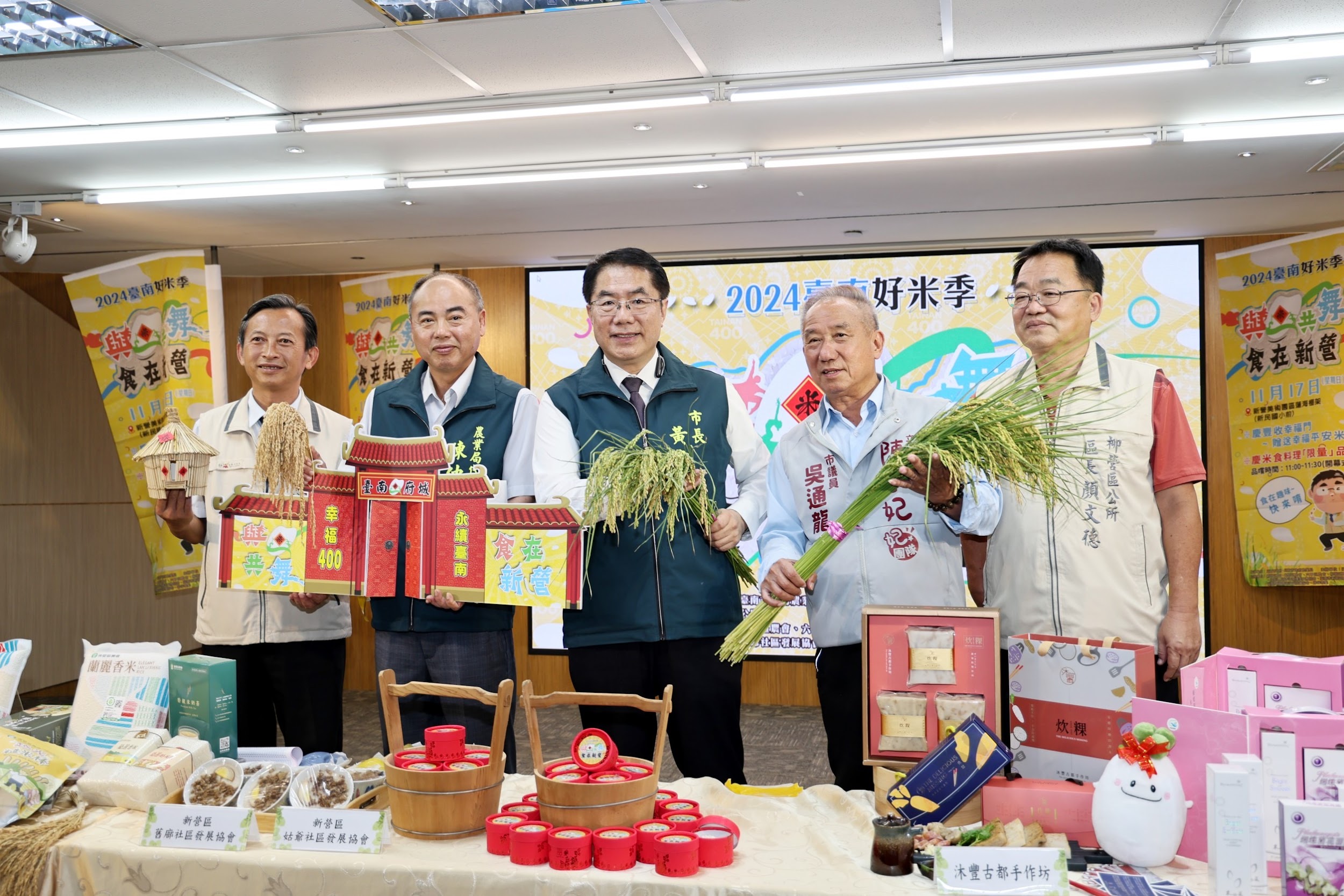 2024臺南好米季將於11月17日於南市新營美術園區的蓮海棚架盛大展開,今(11)日市府於永華市政中心舉行活動記者會,市長黃偉哲、農業局代理局長陳仲杰、新營區長翁振祥、市議員吳通龍及各農會代表共同宣布「2024臺南好米季-與米共舞食在新營」系列活動正式啟動,現場也邀請農業局所輔導新營、後壁、六甲及柳營等良質米地區農會共同展示各式包裝米及米食特色伴手禮,歡迎大家來臺南新營同樂。