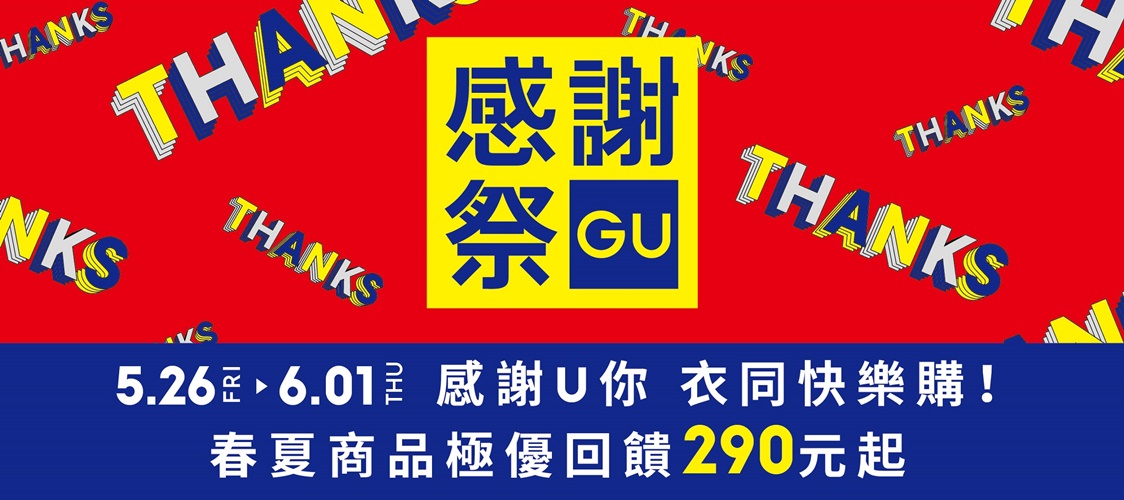 「GU感謝祭」活動期間,只要於實體店舖消費,並於結帳時掃描APP會員條碼,或使用GU APP於網路商店下單,就有機會抽中全台五大遊樂園門票(新竹六福村主題遊樂園、台中麗寶樂園、雲林劍湖山世界主題樂園、高雄義大遊樂世界、花蓮遠雄海洋公園),一人中獎、兩人同行!
