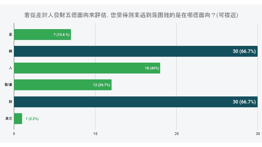好食好事基金會執行長陳茂嘉表示,調查顯示高達7成新創團隊認為產品具競爭性,但創業初期的團隊煩惱,由於成立時間不久產品高度仰賴人工作業,無法機械化生產前有不穩定風險;而超過6成5創業家苦惱資金成本及通路銷售,疑惑如何在社會變動迅速的潮流中擬定行銷策略,也因此僅有1成創業家認為公司具有品牌競爭力。