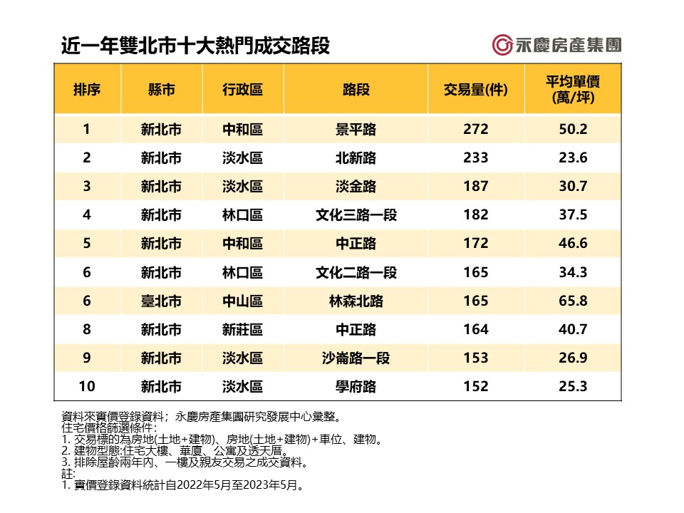 買房是人生大事,而「地段」一直以來都是挑選房產的要點之一,永慶房產集團根據內政部實價登錄資料,統計出近一年雙北市熱門購屋路段並進行排序,其中,新北市中和區景平路以272件交易量奪得第一,淡水區北新路、淡金路則以233件、187件分居二、三名。
