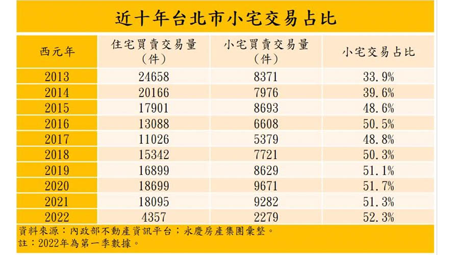 永慶房產集團根據內政部不動產資訊平台資料,觀察台北市近十年住宅交易案件,2013年住宅買賣交易共24658件,其中25坪以下的小宅占比為33.9%,2016年小宅占比突破五成,2017年小幅回檔至48.6%後,自2018年起小宅交易占比已連續五年都在五成以上的水準,2022年第一季更是創下新高,小宅占比高達52.3%,顯示台北市的小坪數住宅已成為市場主流。陳金萍指出,25坪以內小宅佔交易比重連續五年在五成以上,等於在台北市每二間房屋交易,就有一間是25坪以內小宅。探究其原因,主要因台北市房價高昂,根據內政部公布最新資料顯示,台北市房價所得比高達16.22倍,也就是說要16.22年不吃不喝才能買得起台北市的房子,想進駐北市又維持一定生活品質的狀況下,小宅具備低總、低自備的優勢,購屋負擔相對輕鬆,自然讓小宅受到購屋族青睞。