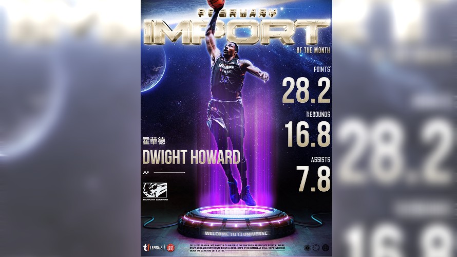 至於二月最佳外援獎項,則由雲豹Kobe艾夫伯(Michael Efevberha)與魔獸霍華德(Dwight Howard)兩位同隊洋將激烈競逐,前者無論是多元進攻手段或華麗單打能力都常讓對手頭疼,而後者則在攻守兩端都有超人般、無人能匹敵的貢獻,而霍華德二月場均28.2分、16.8籃板、7.8助攻,效率值高達44,全方位的數據與超乎水準的表現讓霍華德獲得球迷與媒體一致的青睞,媒體票選獲得15張5分的高分票,球迷也有近1500張的選票支持,最終魔獸壓過隊友艾夫伯首次獲得T1聯盟單月最佳外援。