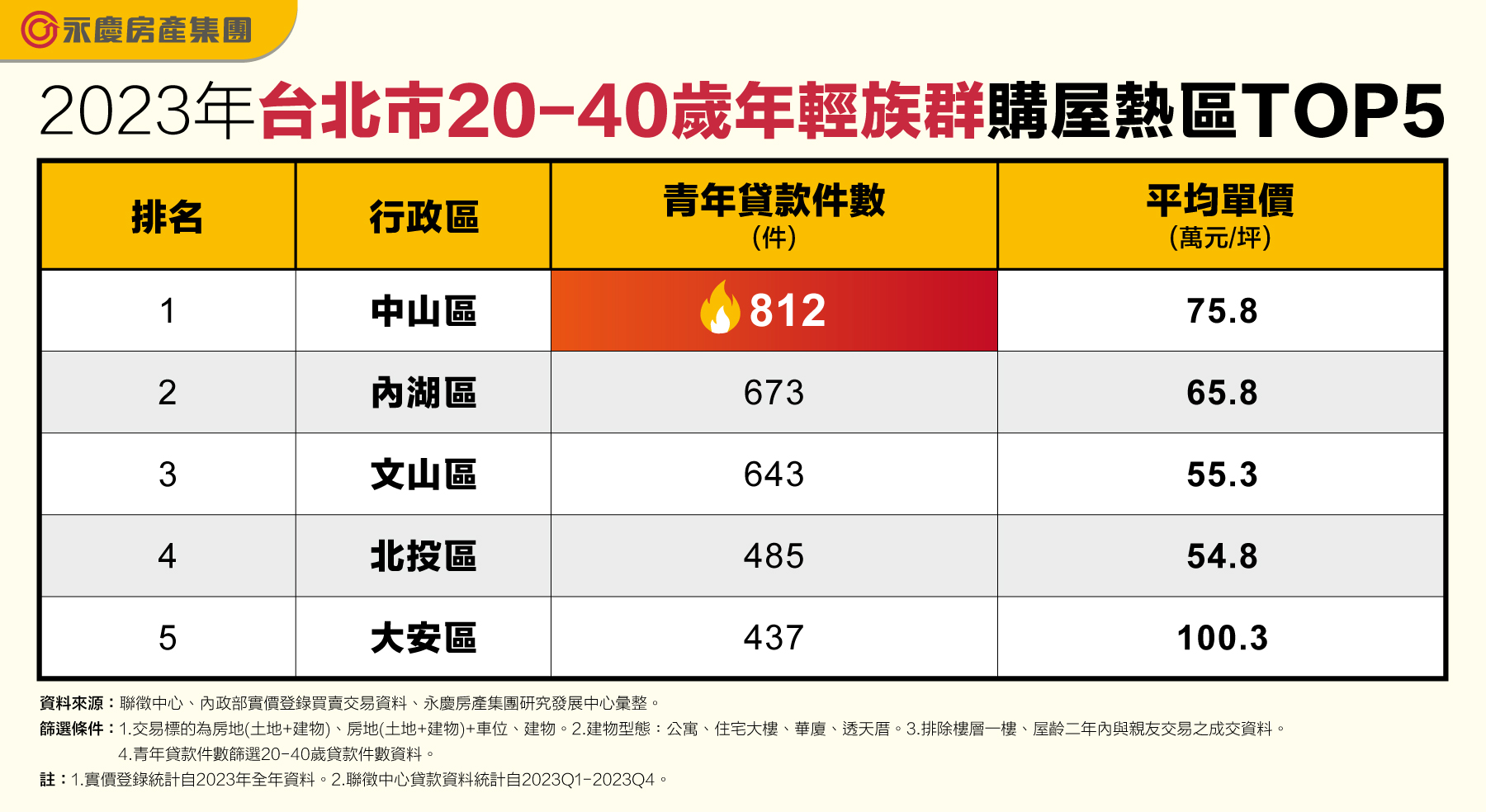 至於台北市,中山區小宅、低總價優勢,吸引年輕族群目光,2023年20-40歲購屋族群共貸款812件,奪北市之冠。陳金萍指出,中山區為台北市早期開發之區域,擁有便捷的交通路網、熱絡的商業活動以及完善的生活機能等優勢,吸引眾多人口居住;近年來建商看準商機,在當地興建許多小宅、套房產品,小坪數、低總價的大樓住宅,購屋負擔相對輕鬆,吸引不少年輕、首購族群卡位台北市門牌。而聯徵中心的貸款數據也能印證這樣的趨勢,中山區的平均建物移轉面積為25.4坪,比台北市平均小了7.3坪;若再從建物類別分析,中山區有高達19%的成交物件屬於套房產品,比台北市平均多出11個百分點。