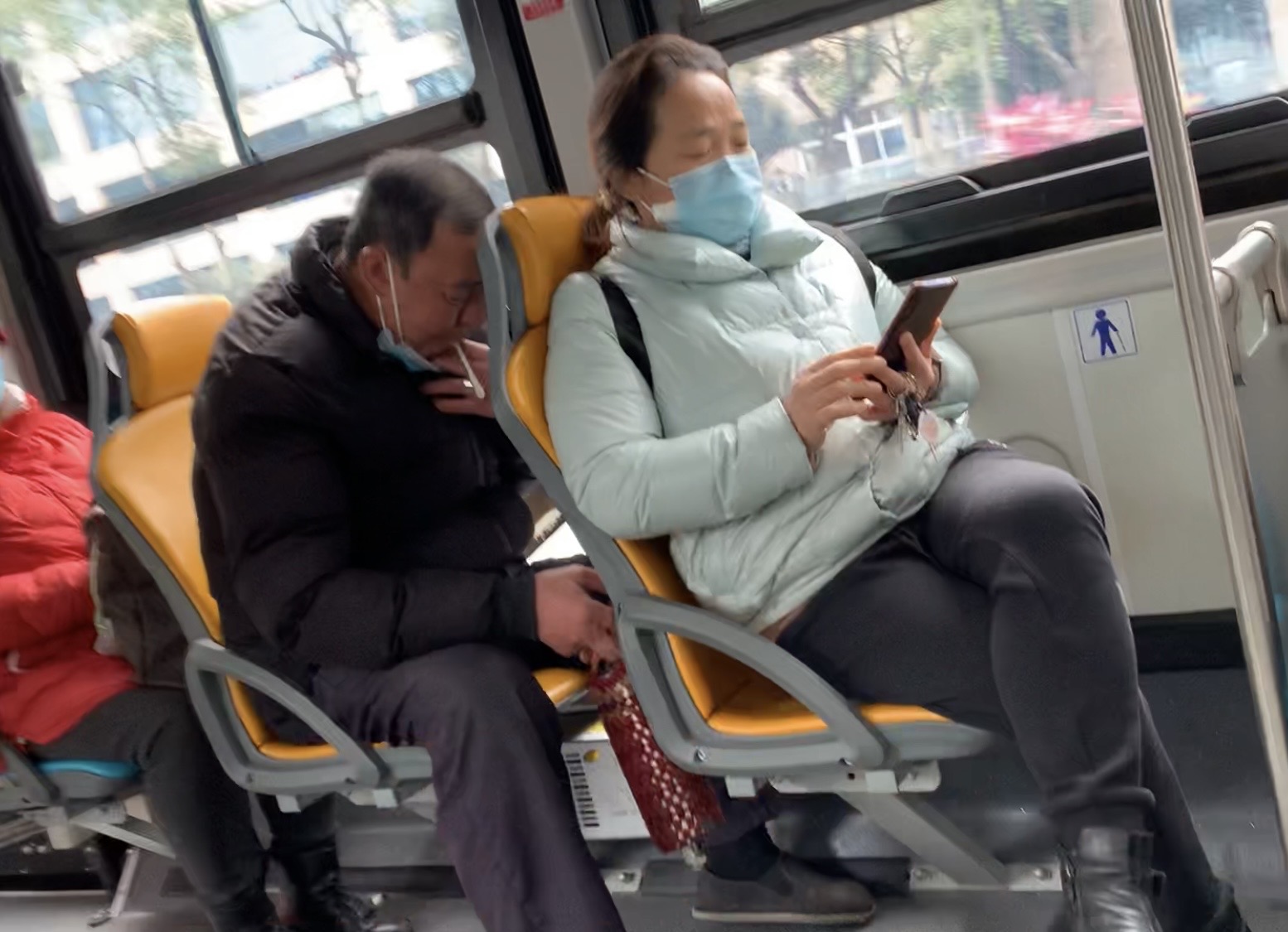 ▲一名成都老伯在公車內不斷咳嗽,還拉下口罩低下頭狂吐痰。劉奕廷攝