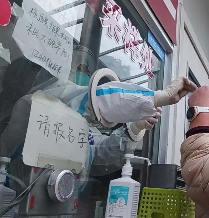 最誇張的是,我們返台前,須提供登機前48小時核酸陰性檢測結果,我們到上海長征醫院付費掛號檢測,在檢驗亭裡穿著防護衣的檢驗員(俗稱大白),竟然是一邊咳嗽一邊幫我們做檢測,我心中想,她八成還沒康復,若是她咳嗽的病毒,混在我們的檢體裡,讓我回不了台灣,豈不冤枉?