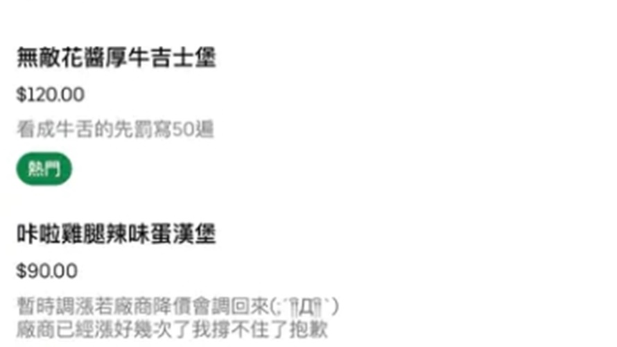 原PO在Dcard上發文,分享看到的外送早餐店備註,除了德式香腸蛋餅和瓜瓜園雙色內餡地瓜球,無糖的一些飲料,店家的備註是寫著「敲碗很久的無糖人類們終於有新選擇了,但是要就只有無糖,老闆懶得用什麼微糖半糖」;誘人的起士薯球,寫的是「聽說名字厲害一點的話就先加分」;咔啦雞腿堡辣味蛋漢堡則註明「暫時調漲若廠商降價會調回來,廠商已經漲好多次了,我撐不住了,抱歉。」